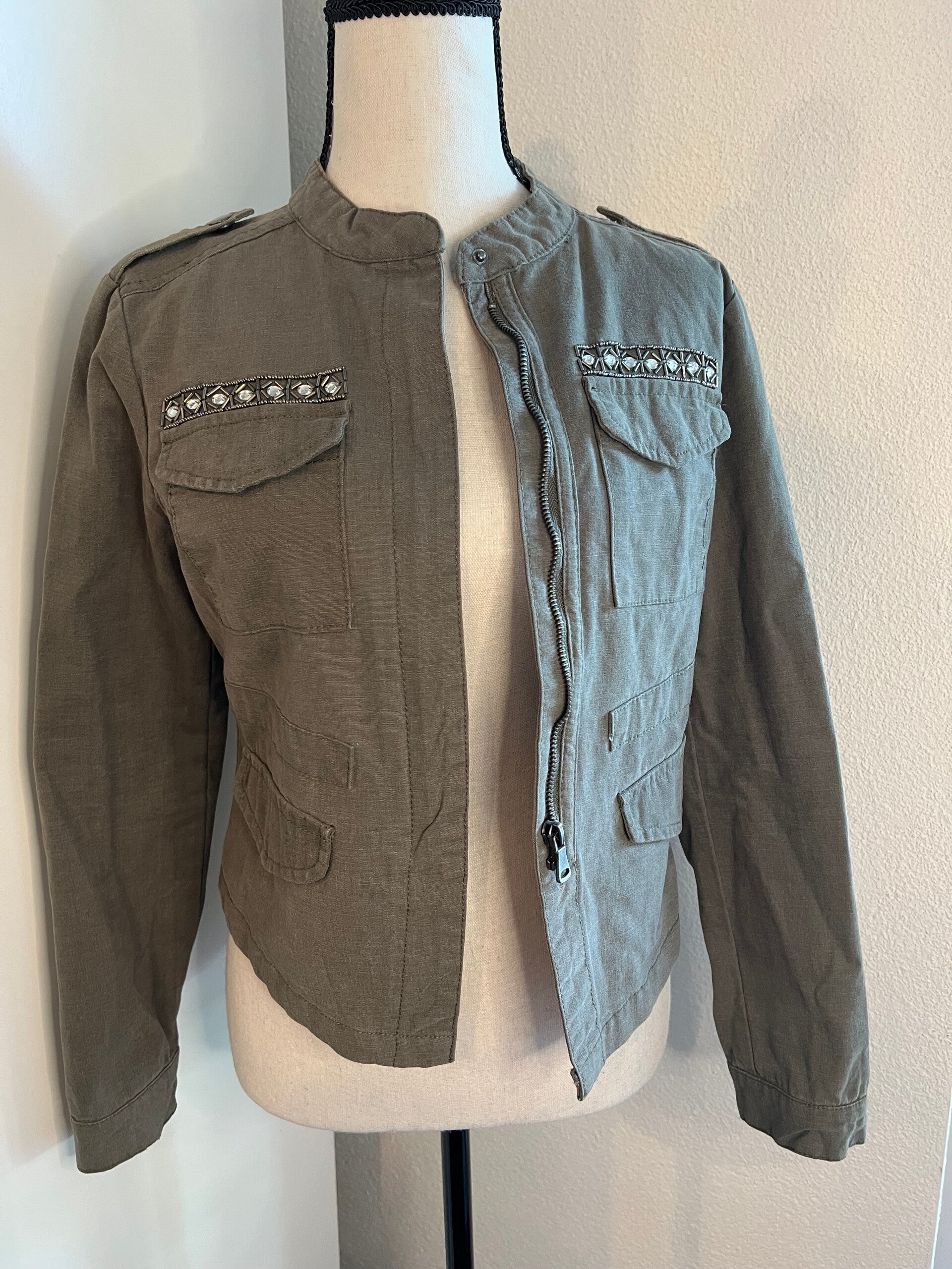 Diese khakigrüne Stoffjacke in Größe S überzeugt mit ihrem schlichten, modernen Schnitt und dem leichten Material – perfekt für den Alltag oder als stylische Ergänzung zu deinem Outfit.