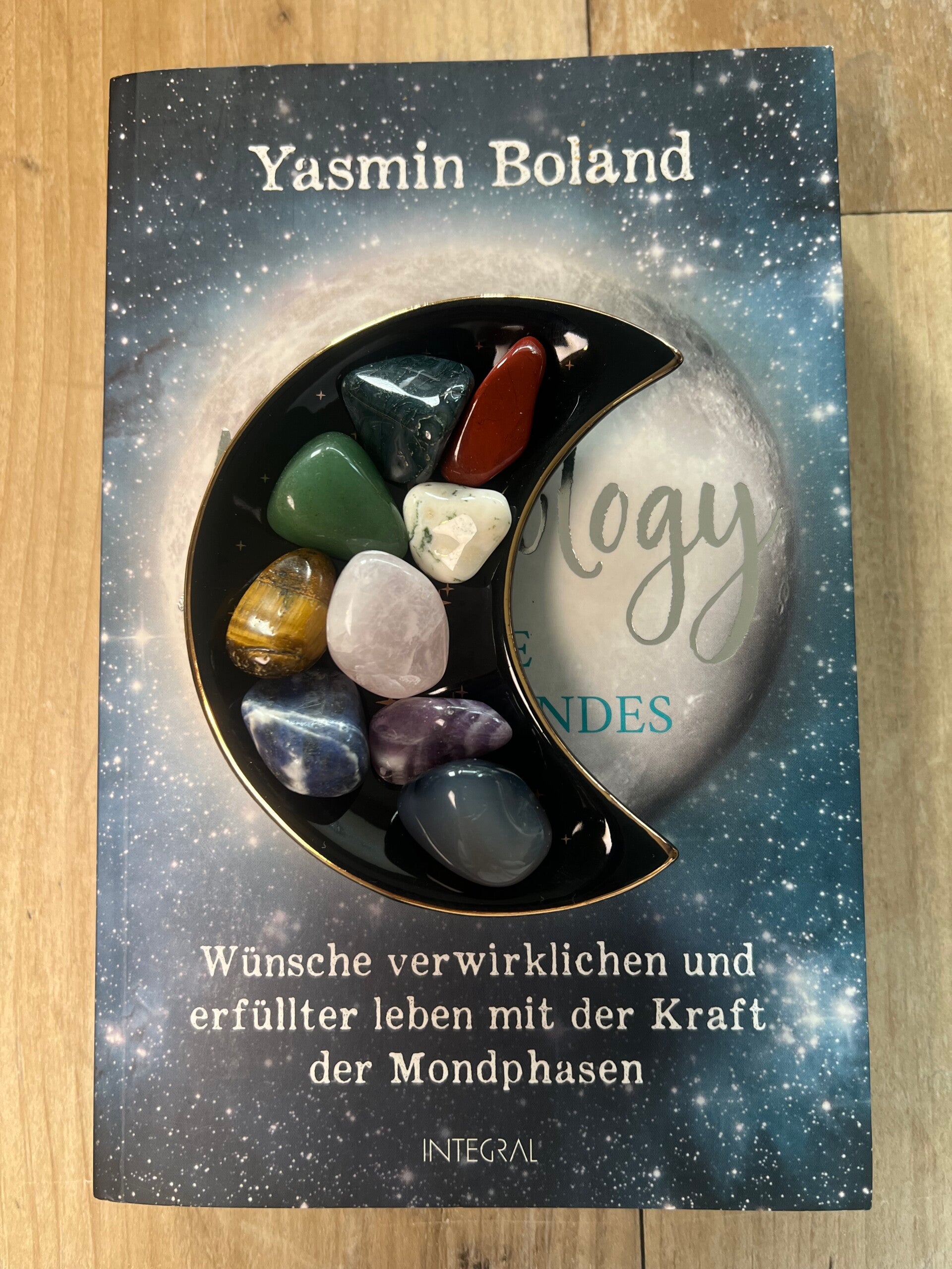 Ein harmonisches Set für deine Mondrituale: Das Buch Moonology führt dich durch die Magie der Mondphasen, während die Mondschale mit neun ausgewählten Heilsteinen deine Rituale energetisch unterstützt.