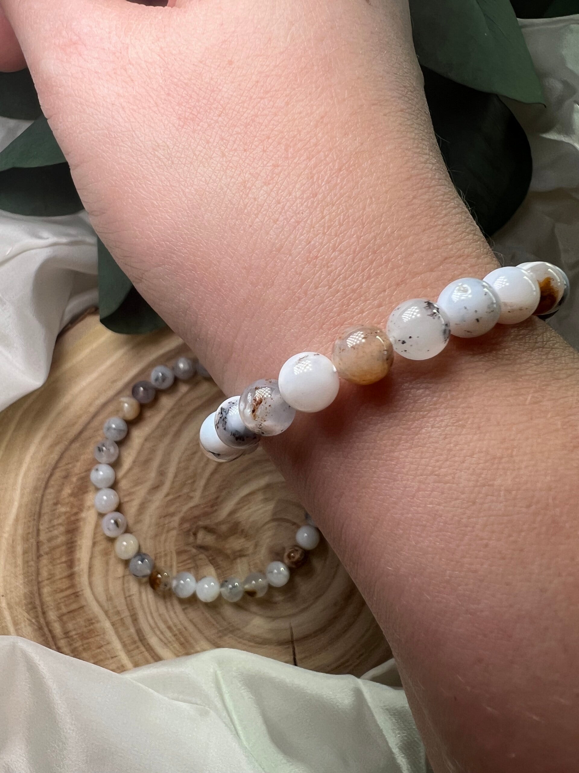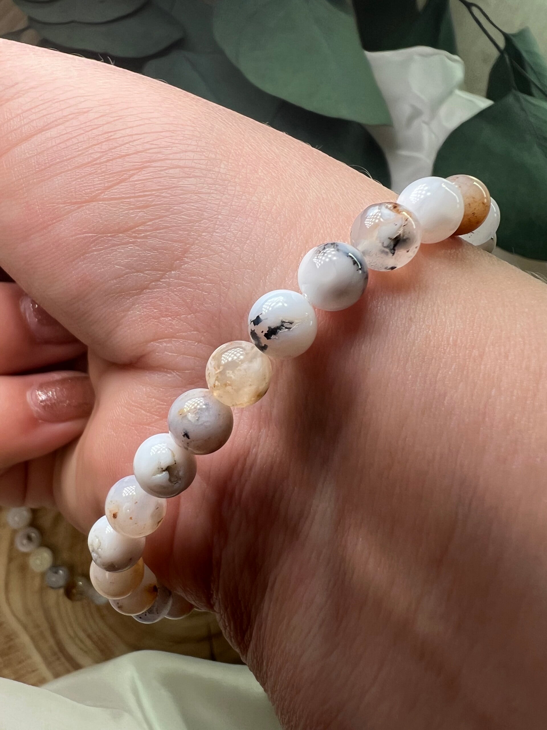 Dieses feine Armband aus hellem Dendriten-Achat (Moosachat) besticht durch seine zarten, moos- und pflanzenähnlichen Strukturen. Seine helle, freundliche Ausstrahlung steht für Neubeginn, sanftes Wachstum und innere Ausgeglichenheit – wie ein Spaziergang durch die Natur.