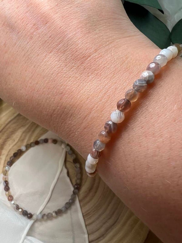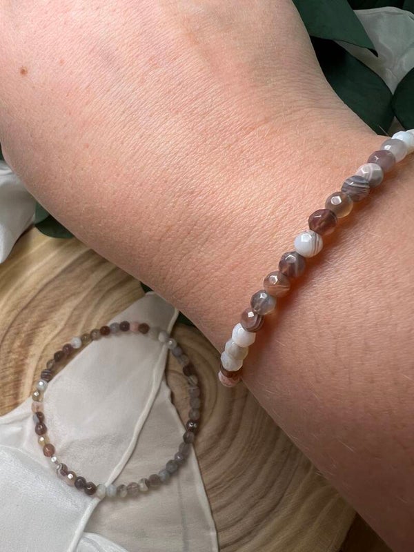 Der facettierte Botswana-Achat (4 mm) besticht durch seine sanften Farbverläufe und sein feines Funkeln. Er gilt als Stein der Stabilität und emotionalen Balance und begleitet dich dabei, Gelassenheit und innere Ruhe in den Alltag zu bringen.