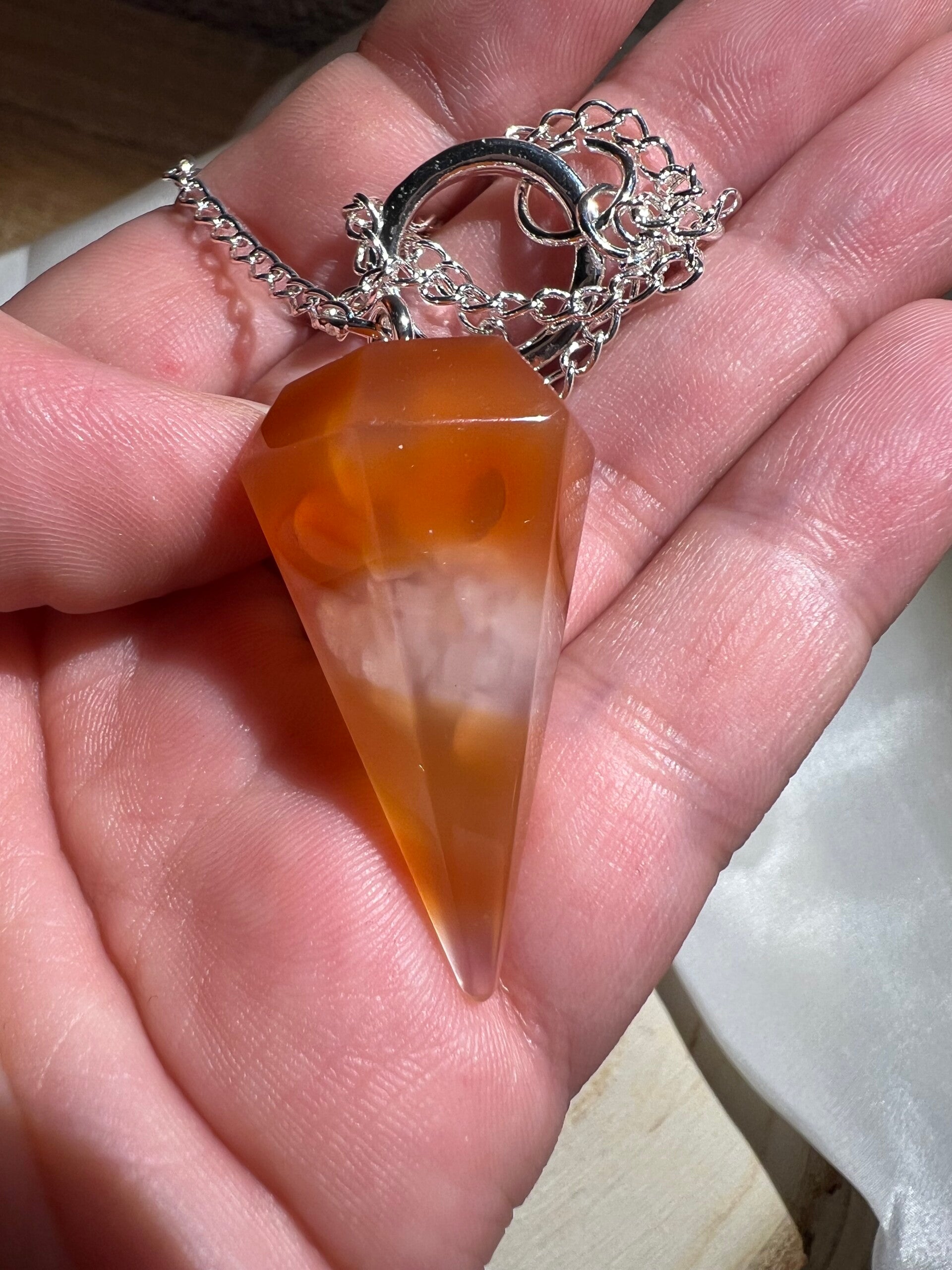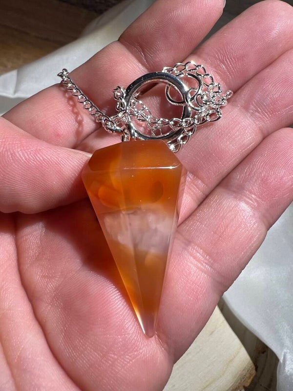 Dieses edle Karneol-Pendel ist ein kraftvoller Begleiter für Meditation, Intuition und energetische Arbeit. Karneol steht für Lebenskraft, Motivation und kreative Energie. Er unterstützt dabei, innere Blockaden zu lösen, Selbstvertrauen zu stärken und Entscheidungen mit Klarheit zu treffen.