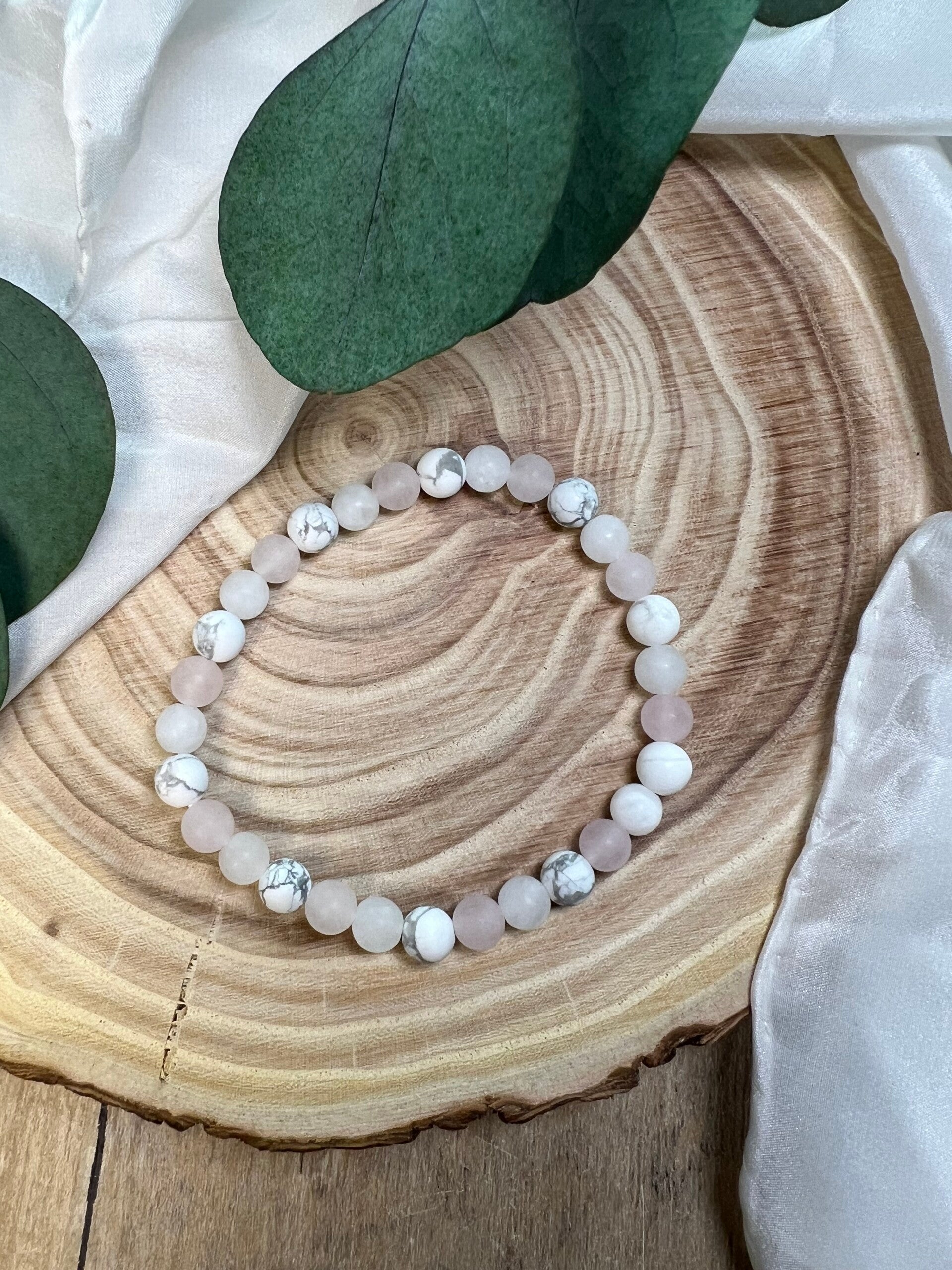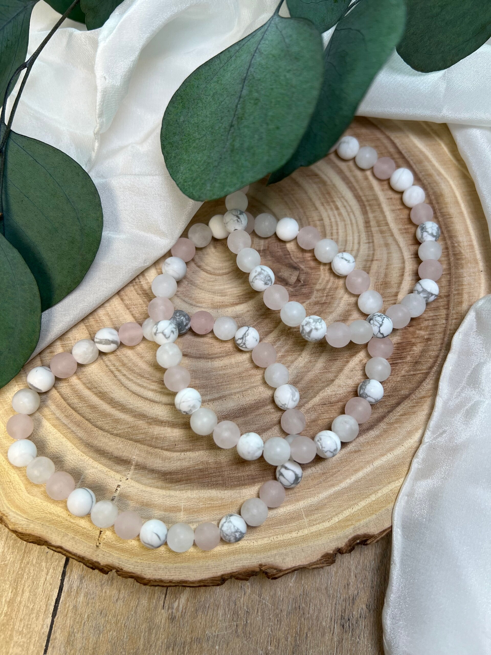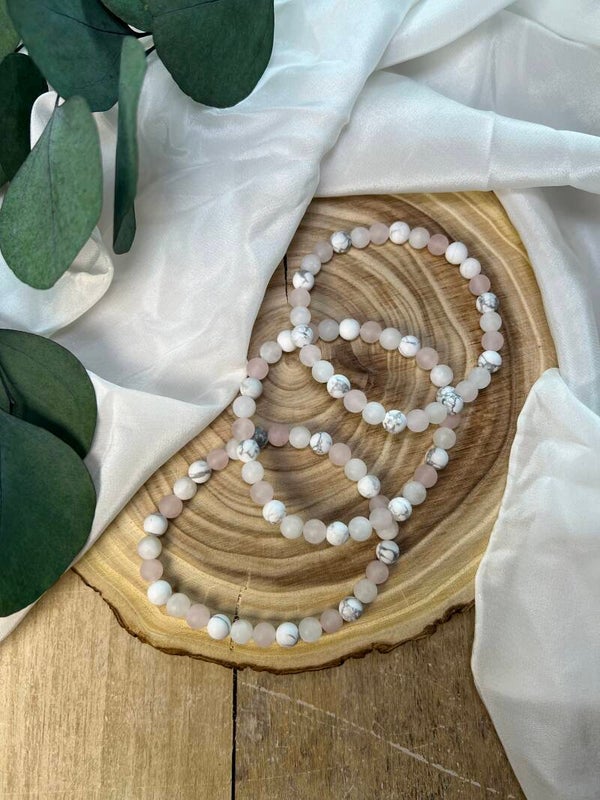 Die Kombination aus Rosenquarz, Mondstein und Howlith wirkt weich, ausgleichend und unterstützend auf emotionaler Ebene.